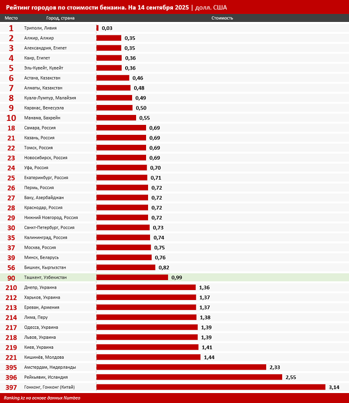В свою очередь в рейтинге среди 397 городов мира столица Узбекистана, Ташкент, заняла 90-е место по дешевизне бензина (0,99 долл. США за литр). Самые низкие цены среди попавших в рейтинг городов СНГ фиксировались в Астане (0,46 долл. США), а самые высокие — в Кишинёве (1,44 долл. США).