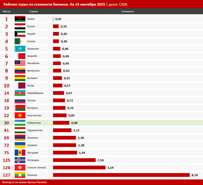 В топ-5 стран с самым дешёвым бензином вошли Ливия, Египет, Кувейт, Алжир и сосед Узбекистана, Казахстан. Самые высокие цены были зафиксированы в Мьянме, Гонконге и Исландии.