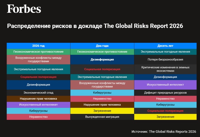 В 2026 году впервые главным глобальным риском респонденты назвали «геоэкономическую конфронтацию» — торговые войны, санкции, инвестиционные ограничения, борьбу за контроль над цепочками поставок и стратегическими ресурсами. Этот риск сместил на вторую позицию лидера прошлого года — межгосударственные вооруженные конфликты. Третья строчка — у экстремальных погодных явлений, четвертая — у социальной поляризации, пятую заняла дезинформация и введение в заблуждение.