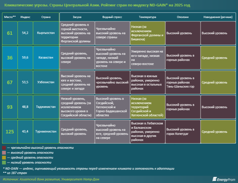 Аналитики АБР в своём докладе указывают: большинство государств Центральной Азии имеют серьёзные климатические угрозы. Поэтому странам так важно участвовать в глобальных экологических инициативах. Главные проблемы ЦА — засуха, водный стресс, оползни в горных районах, речные наводнения. У большинства стран по этим параметрам наблюдается либо чрезвычайно высокий, либо высокий уровень опасности.